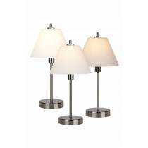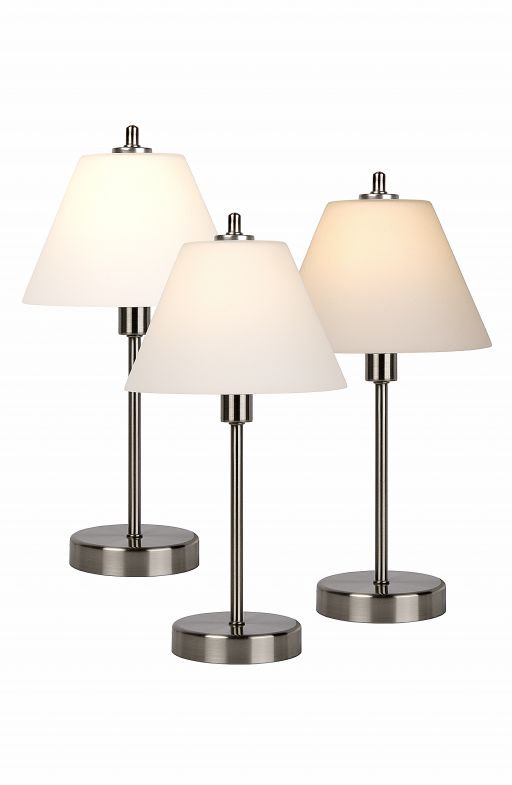 Stolové svietidlá zo série Touch,majú kovový stojan a biele tienidlo.Svietidlo reaguje na dotyk, čím sa vypína a zapína.