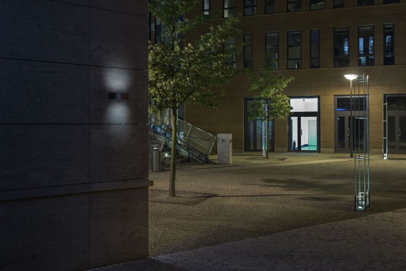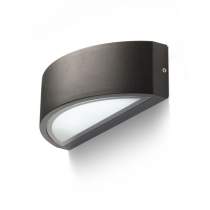 Vonkajšie nástenné svietidlo z tlakovo liateho hliníka. Možnosť výberu z troch farebných variant. Svietidlo je dodávané vrátane kovovej krykty pre zamedzenie svietenia smerom nahor.