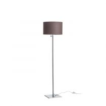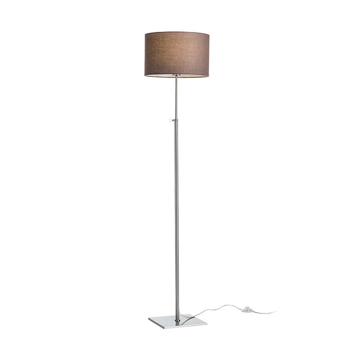 Stojanová niklová lampa s teleskopickou nohou a textilným tienidlom pre žiarovku s päticou E27.