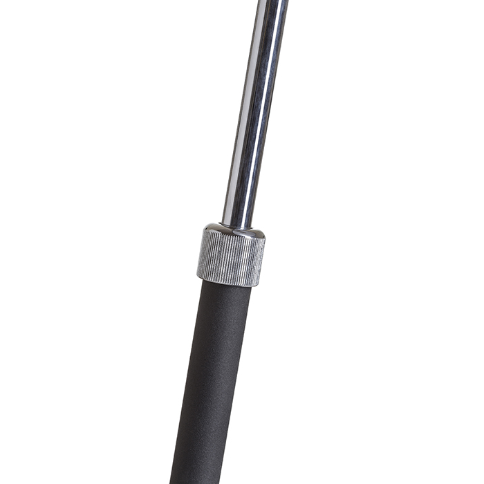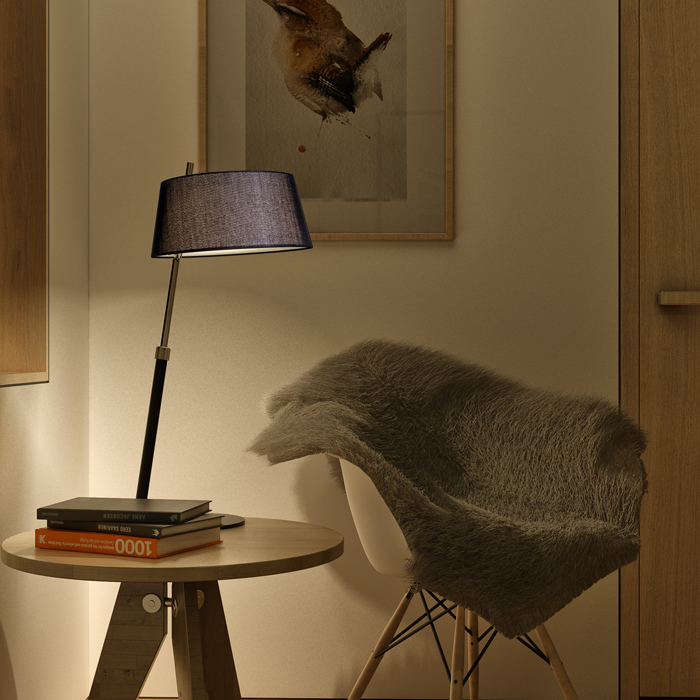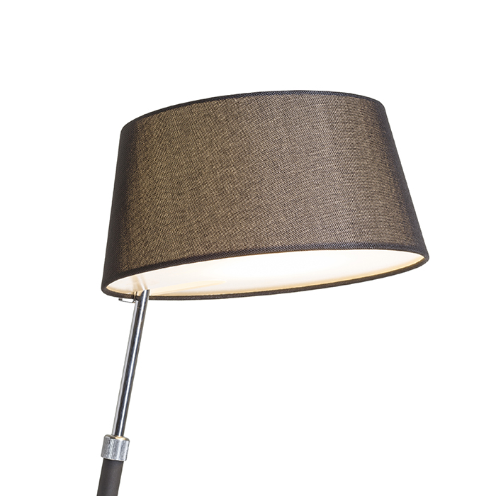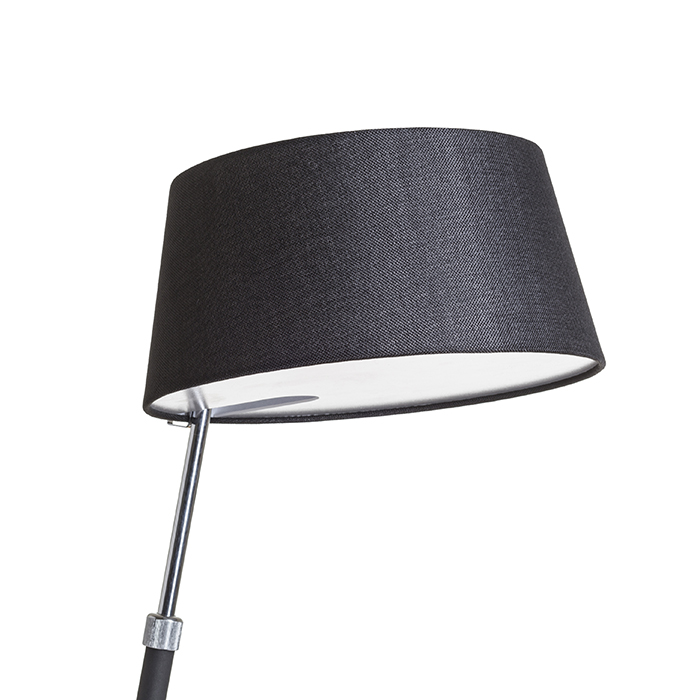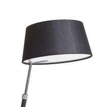 Stolná lampa v čierno chrómovom prevedení a textilným tienidlom s teleskopickým nastavením pre úpravu výšky svietidla. Pre žiarovku s päticou E27.