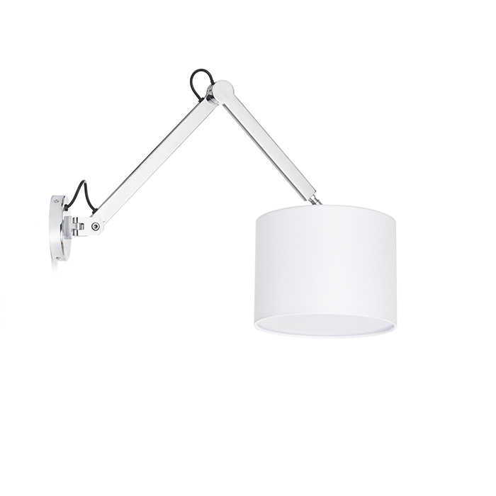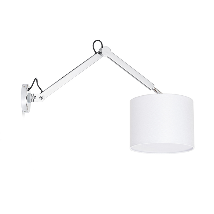 Nástenná dvojramenná lampa s bielym textilným tienidlom, ktoré dopĺňa chrómová konštrukcia.