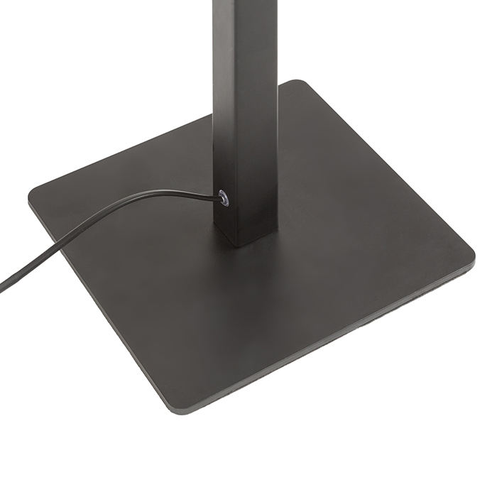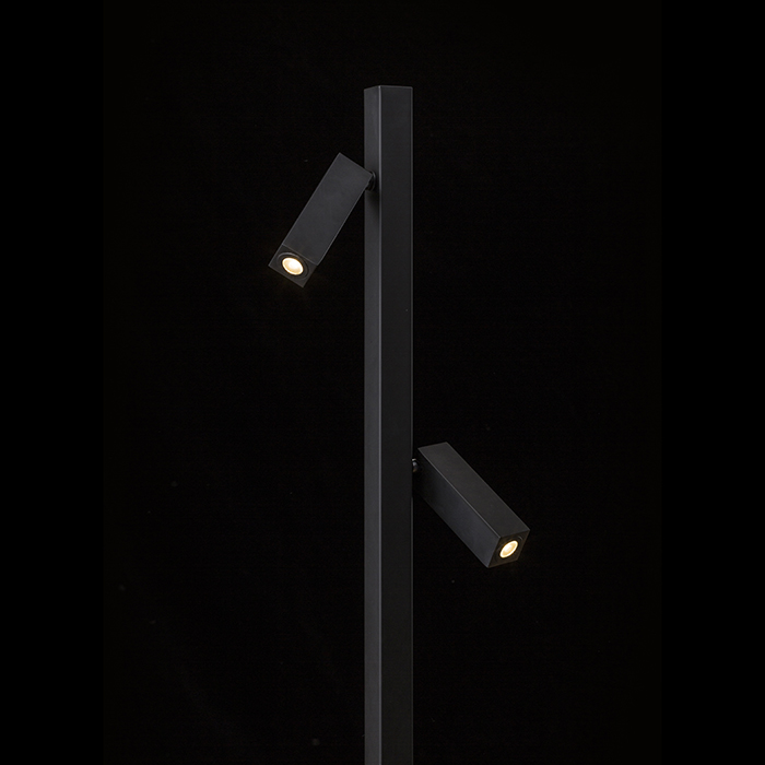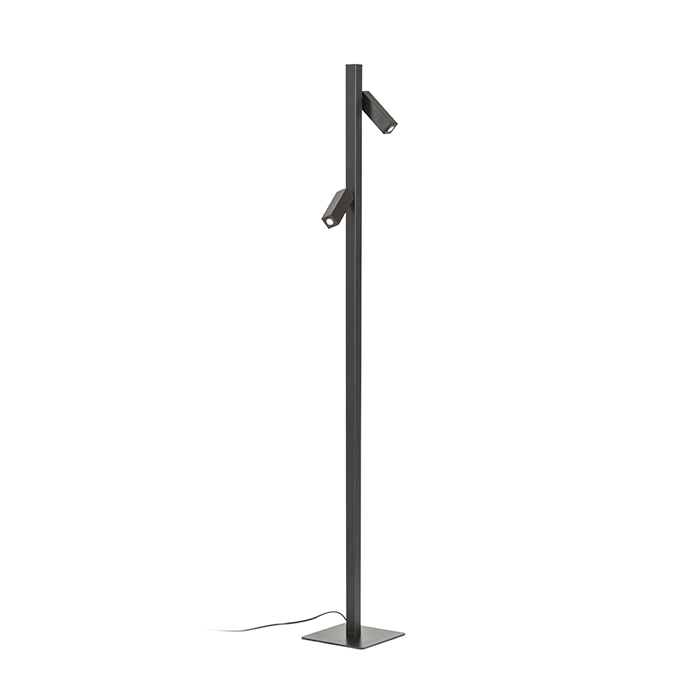 Stojanová lampa v hranatom dizajne s dvoma nastaviteľnými LED reflektormi.