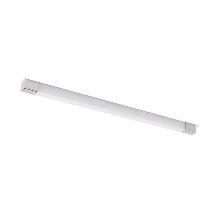 Kúpeľňové hranaté svietidlo s plastovým krytom a chrómovými doplnkami. Vhodné pre použitie do vlhkého prostredia.