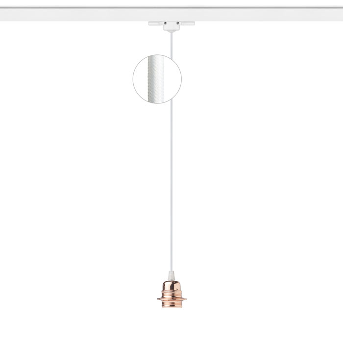 Textilný kábel v rôzných farebných kombináciach s kovovou objímkou E27, pre použitie s dekoratívnou žiarovkou alebo vhodným tienidlom. Kábel je zakončený adaptérom pre zavesenie do trojokruhovej lišty.