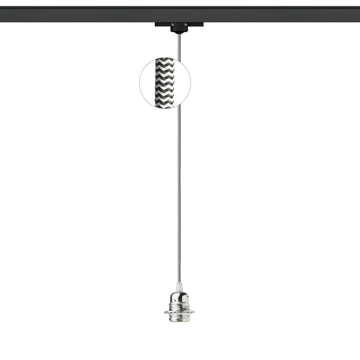 Textilný kábel v rôzných farebných kombináciach s kovovou objímkou E27, pre použitie s dekoratívnou žiarovkou alebo vhodným tienidlom. Kábel je zakončený adaptérom pre zavesenie do trojokruhovej lišty.