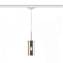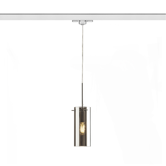Závesné svietidlo so skleneným tienidlom a adaptérom pre trojokruhovú lištu. Vzhľad nerozsvieteného svietidla je zrkadlový a po rozsvietení sú čiastočne viditelné svetelné zdroje.