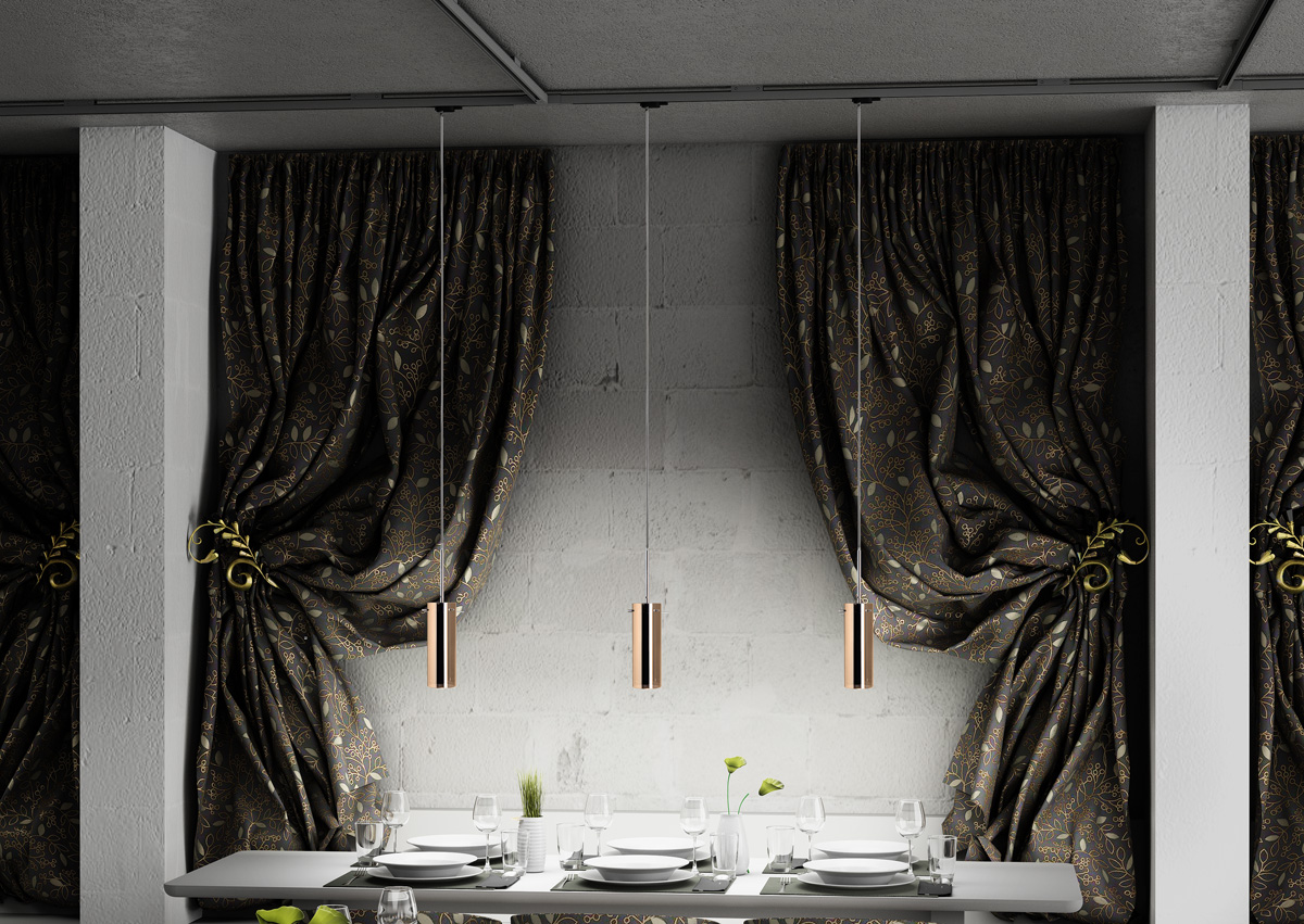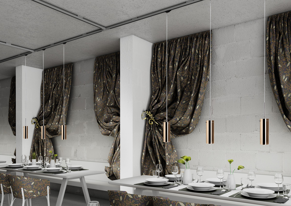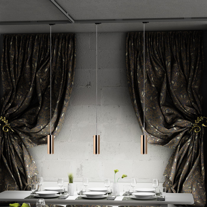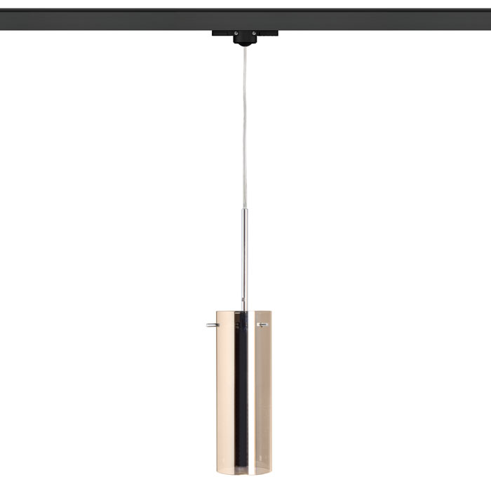 Závesné svietidlo so skleneným tienidlom a adaptérom pre trojokruhovú lištu. Vzhľad nerozsvieteného svietidla je zrkadlový a po rozsvietení sú čiastočne viditelné svetelné zdroje.