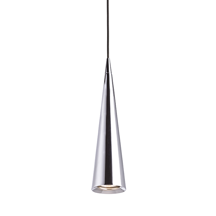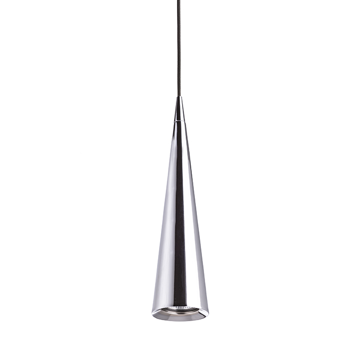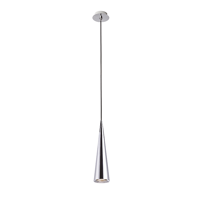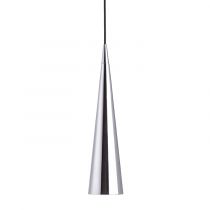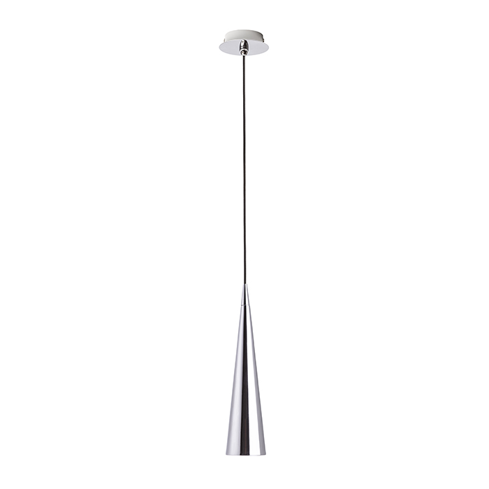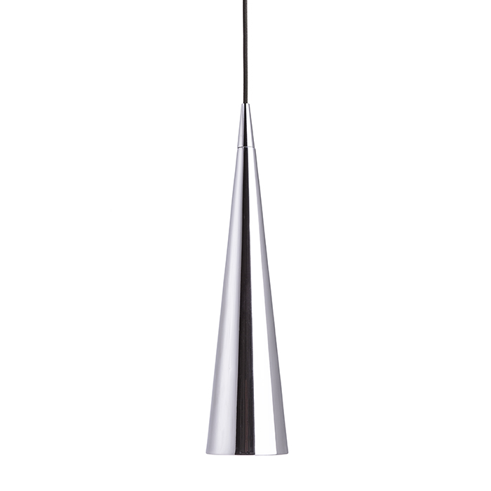 Závesné svietidlo s chrómovým tienidlom a stropnou základňou. Čierny textilný kábel.