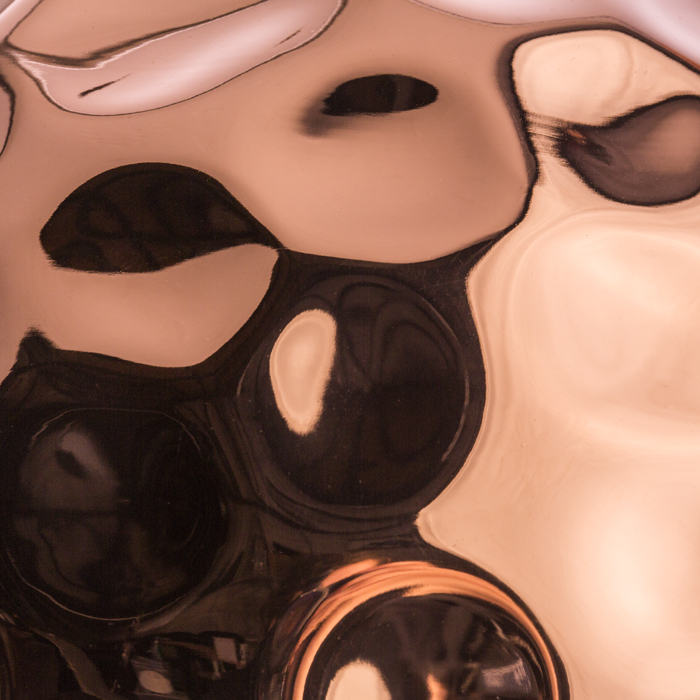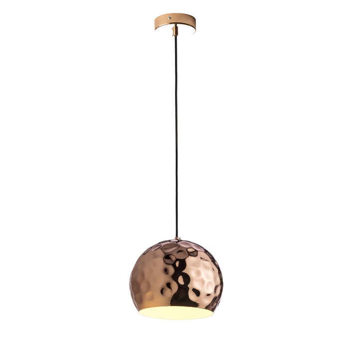 Závesné svietidlo s premačkaným kovovým tienidlom. Vonkajšia strana tienidla je medená, vnútorná strana je bielo lakovaná. Dodávané s čiernym PVC káblom a medenou stropnou krytkou.