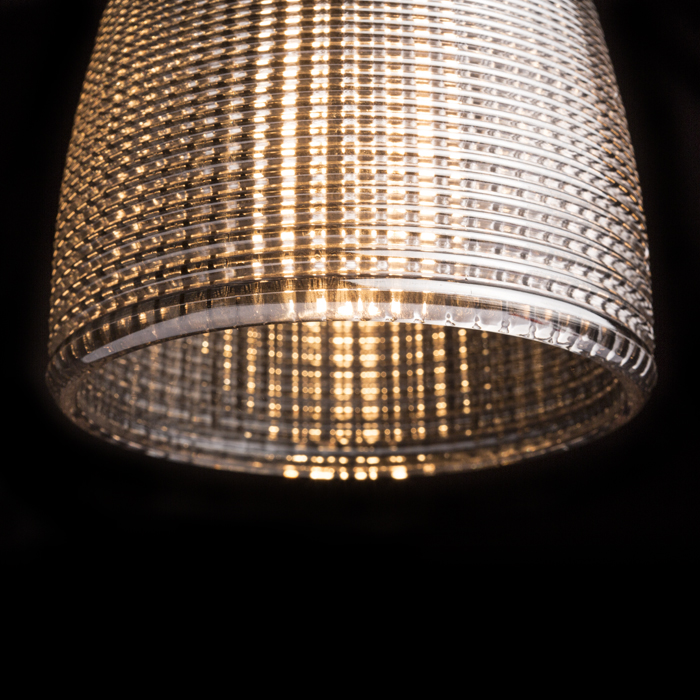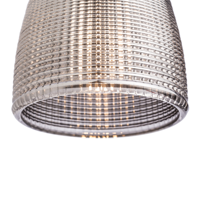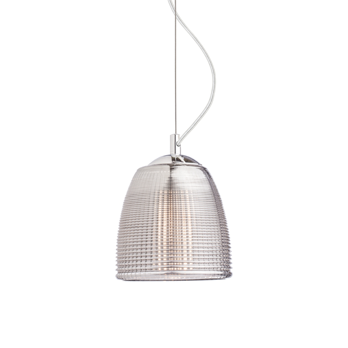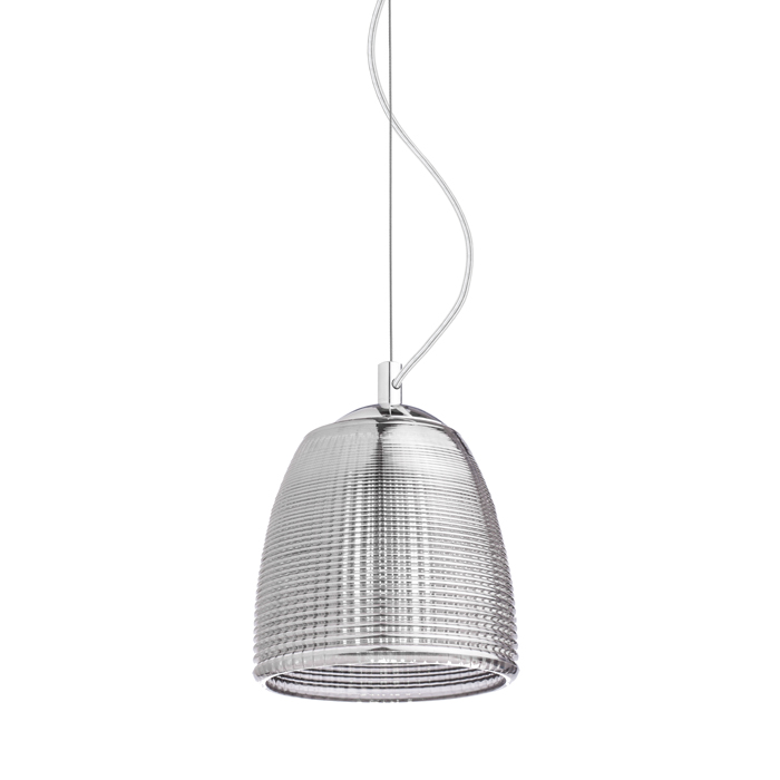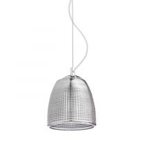 Elegantné závesné svietidlo so štruktúrovaným sklom a chrómovými doplnkami.