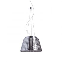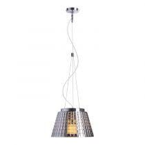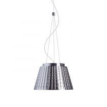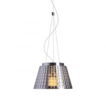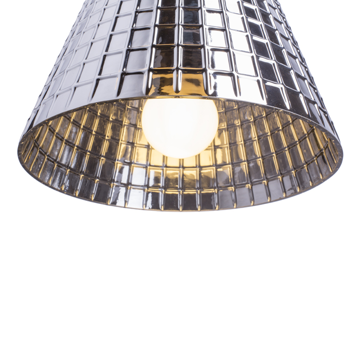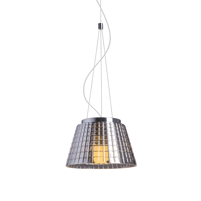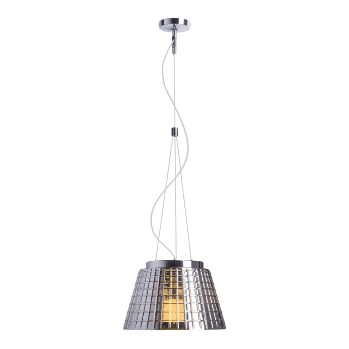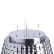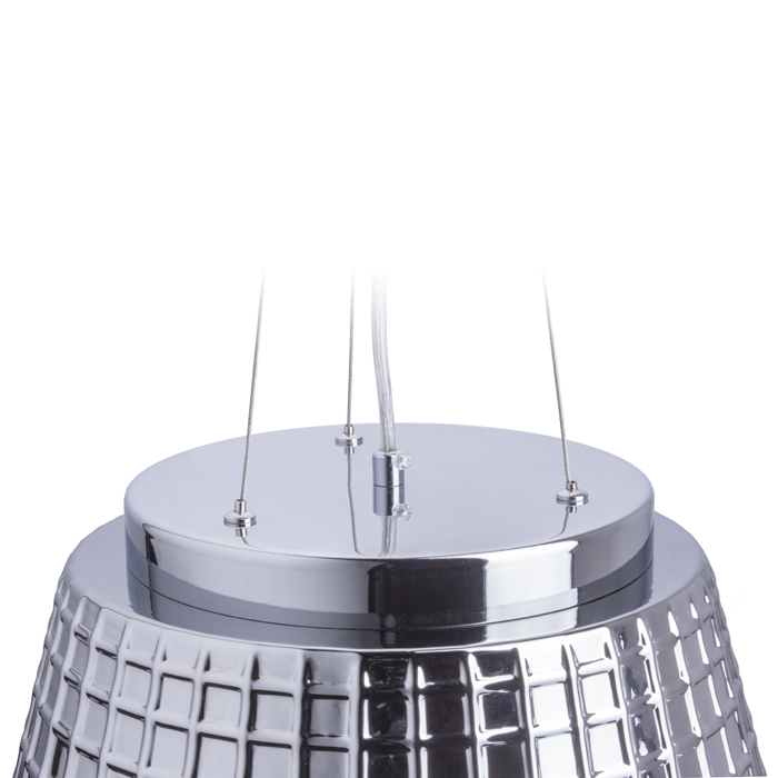 Závesné svietidlo s masívnym štruktúrovaným sklom. Sklo je z oboch strán pochrómované. Pri rozsvietení je svetelný zdroj čiastočne viditeľný.
