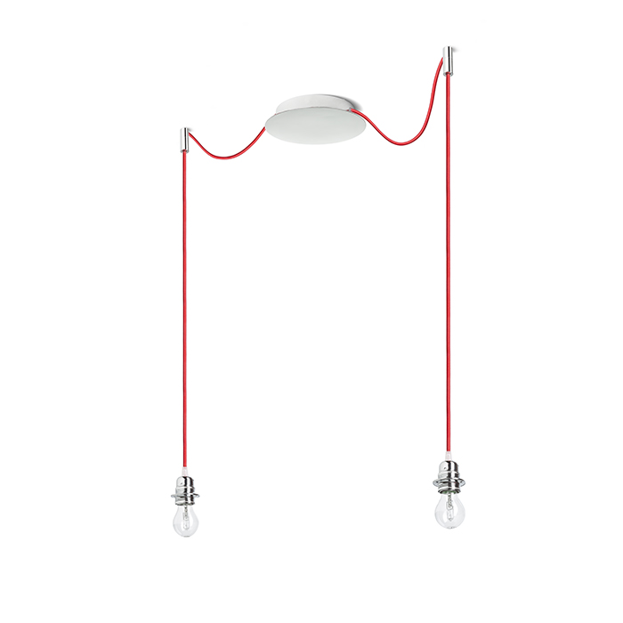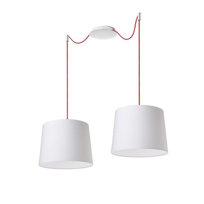 Závesné svietidlo s centrálnou stropnou základňou a dvomi jednotlivými textilnými závesmi s kovovou paticou E27. Závesy sú opatrené stropnym chrómovým úchytom, ktorý je umiestnený do individuálnej vziadelnosti od základne. Dĺžka káblu 3m. Vhodné pro tienidlá: ARISTA, DELI, JAKARANDA, COCTAIL, DOUBLE 40/30, DOUBLE 55/30, ASPRO 40/30, ASPRO 55/30, RON 15/20, RON 40/25, RON 55/30, TEMPO 15/30, TEMPO 30/19.