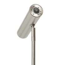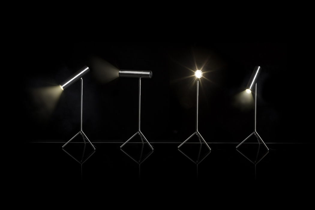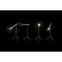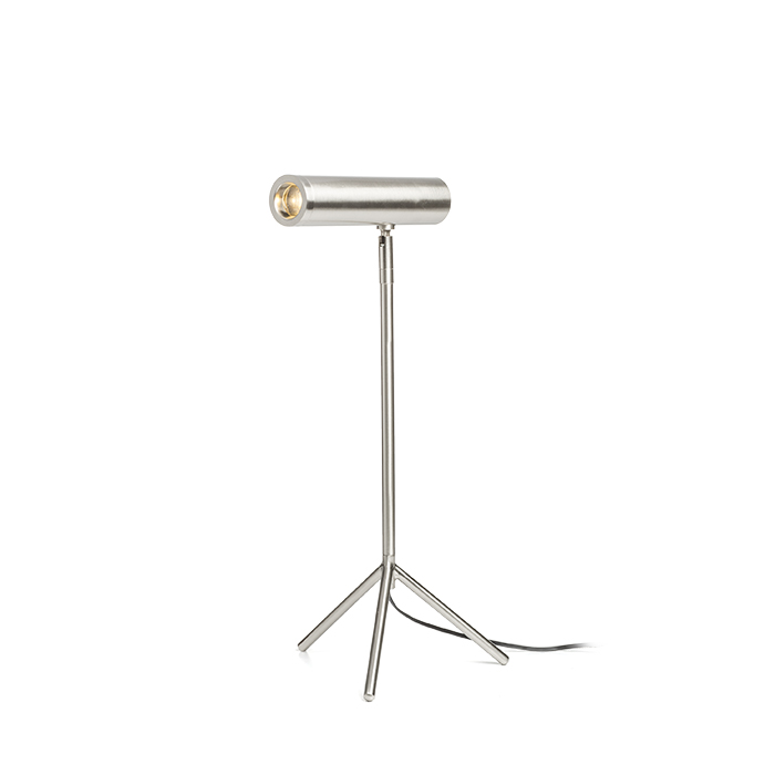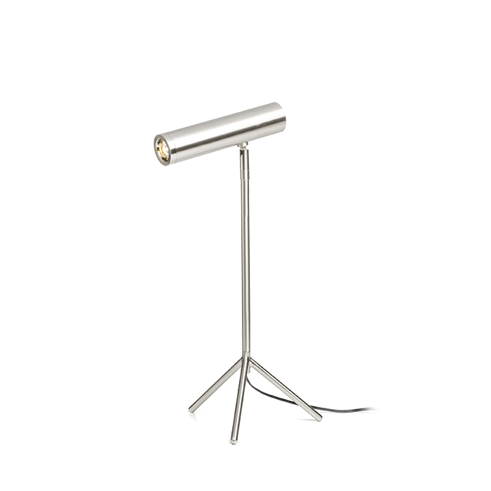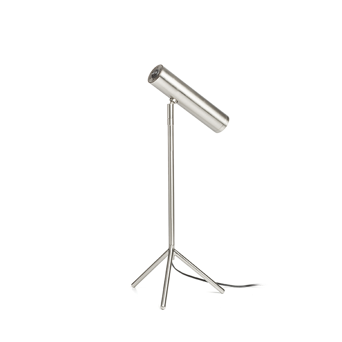 Elegantné LED stolné svietidlo na trojnožke v povrchovéj úprave matného kovu. Transformátor je súčasťou adaptéru do zásuvky.