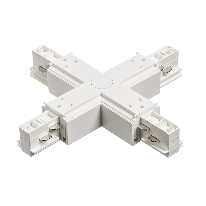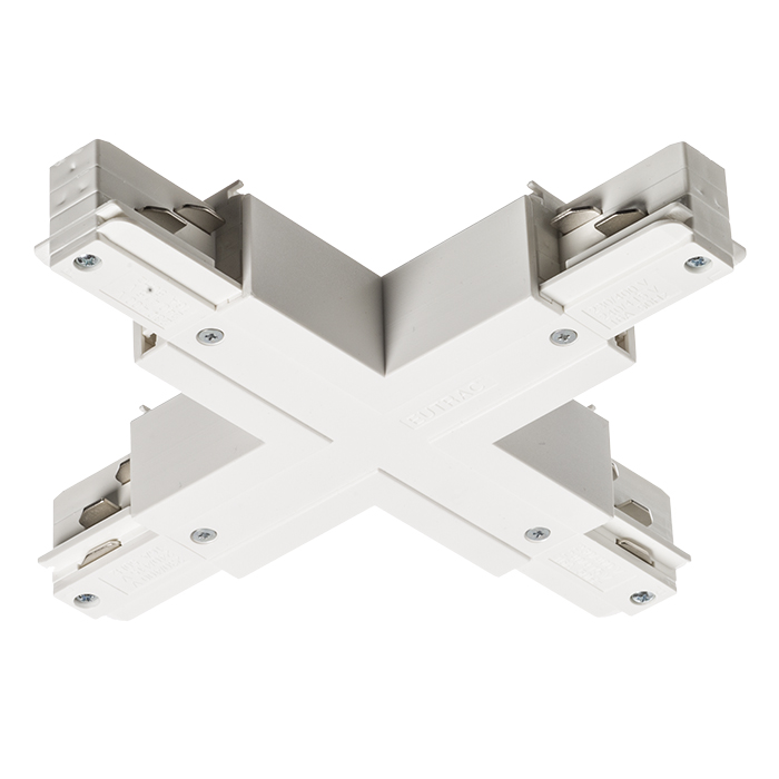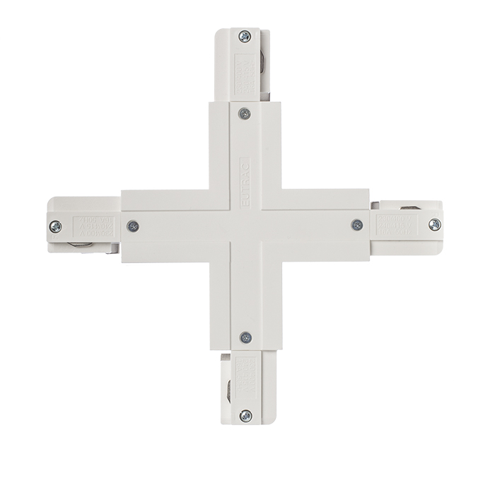 X-spoj s možnosťou napájania pre trojokrúhovú lištu EUTRAC. Dva napájacie okruhy.Možnosť zaťažiť maximálne 16A.